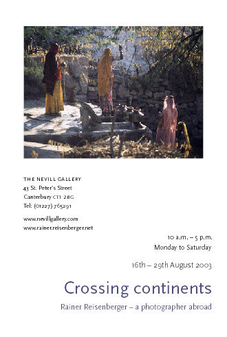| The Photographer | Rainer Reisenberger Born in Vienna of Romanian-Hungarian gypsy origins, he was evacuated and exiled to the Swiss border as the Russians engulfed Vienna at the end of the war. There followed an idyllic mountain childhood and his first camera. Following a university career in Law and Languages and land surveying work that awoke an intense interest in the landscape, he became Curator of Photographic Media at Vienna’s Museum of History. A confirmed Anglophile, he moved to Watford at 23 and worked as a psychiatric nurse and then taught languages. All the while he was taking photographs. He died before this exhibition came to fruition, but was based in Canterbury for 23 years where he divided his activity between his translation company and frequent photographic trips to ever more exotic places. "My eye as a photographer is for detail or composition, balance between light and shade. I nearly only take pictures in late afternoon, almost exclusively in colour, and prefer telephoto lenses. I only takes slides, mostly various Fujichromes, sometimes Agfa, hardly ever Kodak. I work quickly, and nearly always crop tightly in the viewfinder, with no later cropping." |