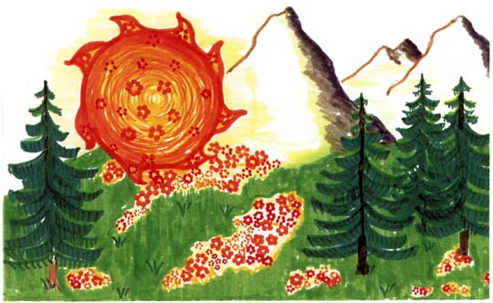 Enormous, huge and golden was the Sun as he began rolling down the dome-shaped roof of the mountain palace. Over the tops of the trees he floated, gliding over the stiff tall wood, which became splendidly warm and friendly, glowing with light and joy. And slowly he slid down into the soft green of the emerald meadows where flowers of fiery beauty sprang into bloom. The veils of mist, which the grass and the trees had breathed out so thoughtfully, as they do every night, cushioned his downhill journey. Every now and again, the swirling mist had to tug quite hard at the Sun to stop him gaily gambolling down the hillside -and when it bravely tried to catch hold of him, it shone up in a wild bunch of brilliant colours like a rainbow of fireworks. |