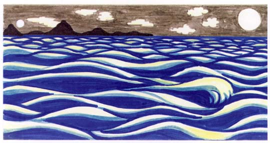 Now it was time for the Moon to take over. After all, it was her birthday as well, and so she was to perform as Full Moon -something she had been looking forward to for a full twenty-eight long days. The clouds untangled their silvery fingers and retreated respectfully. At long last, the Moon could pour out all that cool and smooth silver light she had been so eager to give away, and a coat of tinsel settled on the land. But the Sun rolled and tossed about in the river, turning round and round - and she had such a good, deep, thorough bath that all the water turned to liquid gold. The splendid glow spread and travelled out further and further into the deep night, mingling with the silver light of the Moon. In the end, all the gold flowed out into the sea, which became placid and plated with a fine foam of gold. Under this soft down of golden waves and ripples' the Sun slept a good night's sleep until it was time to wake up again from his slumber, gather all the gold together - and, perhaps, rise again. |